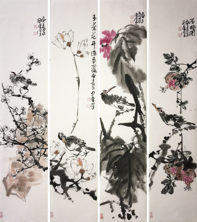 00223 柳常学 花鸟四条屏 23cm x 105cm x 4